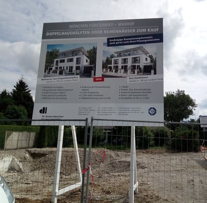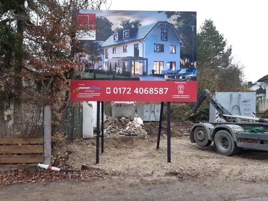Mit der Bezeichnung Holz Bautafel oder Holz Bauschild sind Systeme mit eingegrabenen Fundamenten gemeint. Die Konstruktion besteht meistens aus Holz (Nadelholz S10, gehobelt), welches im Boden einbetoniert wird. Solch ein Bauschild mit nicht sichtbaren Fundamenten ist optisch auf jeden Fall ansprechend. Optional kann das Holz auch noch weiss gestrichen werden oder aus optischen Gründen Stahl-Gitterträger verbaut werden. Die bedruckten Bautafelblenden sind auch hier aus 3mm starken Alu-Verbundplatten, welche auf eine Holzunterlattung angebracht werden. Durch die Montage mit Ort-Beton spart man sich die teure Anlieferung von mobilen Beton-Fundamenten mit LKW und Kranfahrzeug. Somit sind Holzbautafeln preislich immer günstiger als die mobilen Systeme. Desweiteren werden die Holzkonstruktionen nach Einsatzende in der Regel vom Bauunternehmen vor Ort entfernt oder durch unsere Mitarbeiter umgesägt. Es fällt auch hier kein teurer Abtransport durch LKW und Kranfahrzeug an.