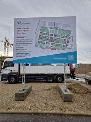 Bautafeln mit mobilen Fundamenten können so gut wie überall aufgestellt werden und auch einfach wieder versetzt werden - das ist der größte Vorteil von diesem System. Das gewünschte Motiv/Layout für die Bautafel wird auf 3mm starke Alu-Verbundplatten gedruckt. Der Druck ist wetterfest und wird mittels einer Trägerfolie auf die Alu-Platten geklebt. Mit dieser bewährten Technik können wir jederzeit auch mal ein Bauschild neu folieren oder teilweise neu überkleben. Montiert werden die Motiv-Platten auf eine Holzunterlattung, welche von vorne nicht sichtbar ist. Der Rest der Konstruktion unserer mobilen Leihsysteme ist aus Aluminium Gitterträgern oder bei größeren Formaten auch aus Stahlgitterträgern. Die Fertigfundamente werden mit unserem mobilen Kranfahrzeug auf den gewünschten Standort gehoben. Im Gegensatz zu eingegrabenen Bauschildern spielt der Untergrund hier keine Rolle bzw. können mobile Fundamente auch auf geschlossenen Böden gestellt werden wie z.B. Asphalt, Pflaster oder Betonböden.
